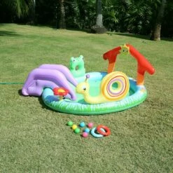 Una minipiscina da giardino coloratissima, Inclusi 2 anelli gonfiabili, 6 palline che faranno giocare il tuo bambino, uno scivolo e uno spruzzatore d’acqua fissato sul bordo.
