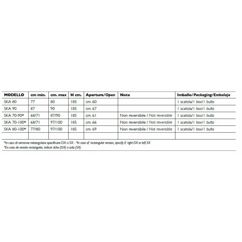La cabina doccia è disponibile nelle misure 80×80, 90×90, 70×90, 70×100 e 80×100 con le possibilità di estensione come indicate nella scheda tecnica che potete trovare nella galleria immagini del box doccia “Ska”.