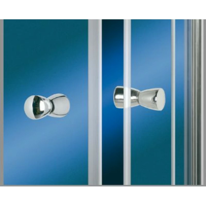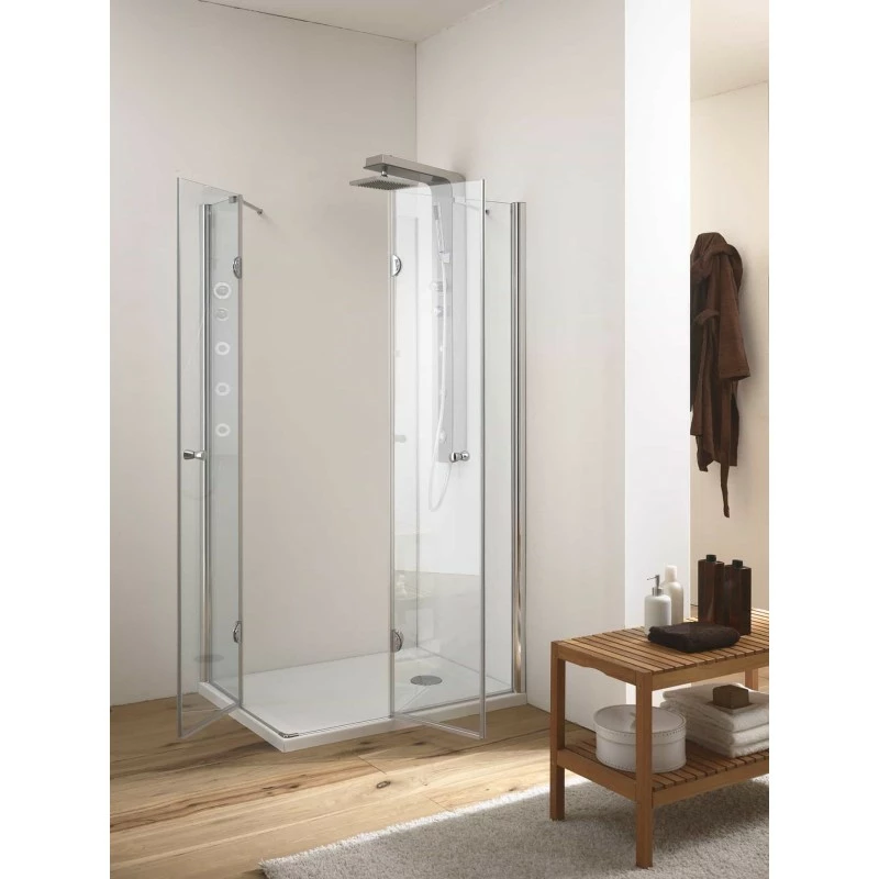 Cabina doccia ad angolo con porte battenti con cerniera e due fissi disponibile nei colori argento satinato e cromo e pannelli in cristallo trasparente spessi 6 mm.