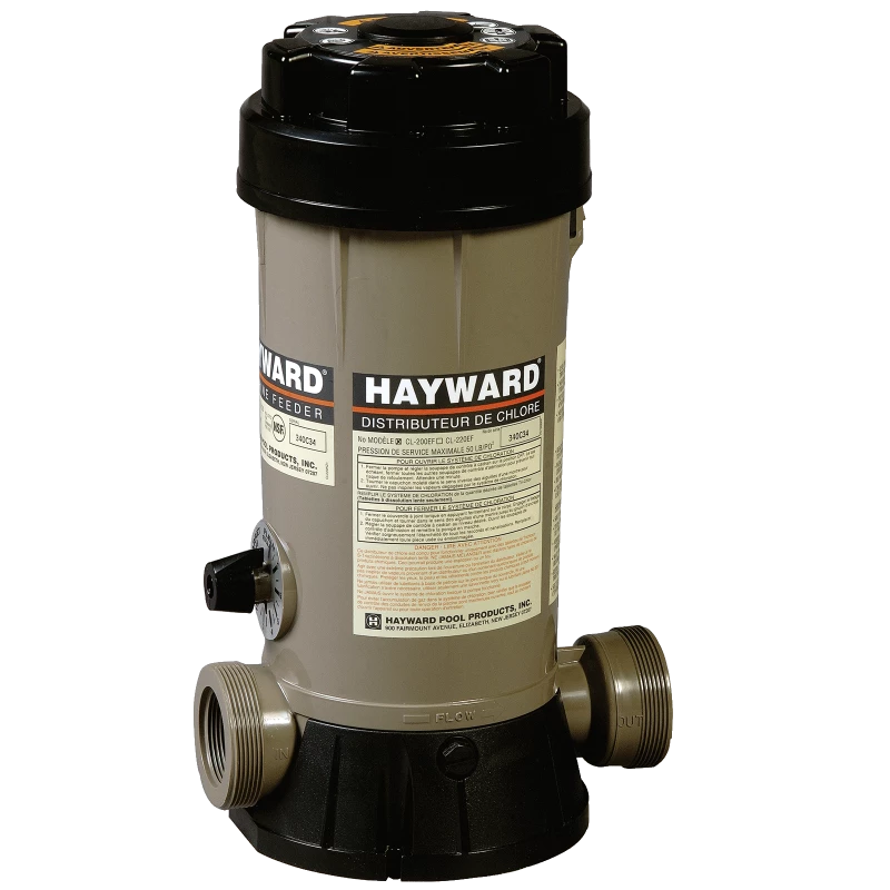Il dosatore Hayward® consente di distribuire il cloro nell’acqua della vasca, in modo tale da sottoporla a trattamento continuo e costante.