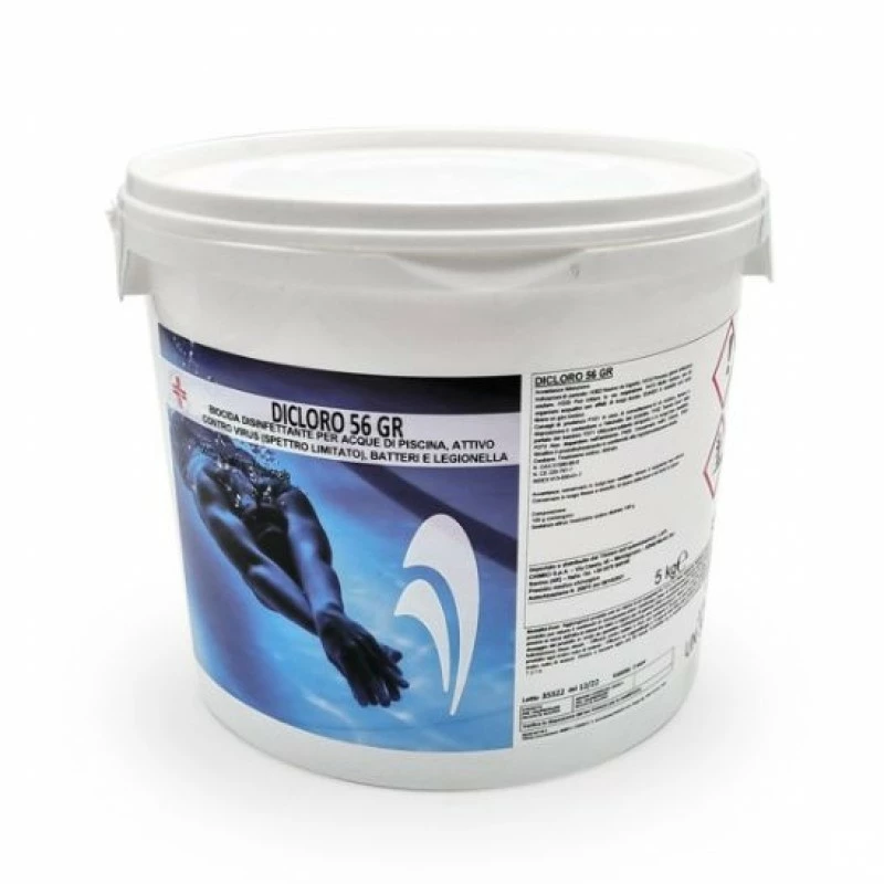 Il cloro per piscina al 56% granulare ad azione shock è perfetto per la disinfezione dell’acqua. Nello specifico, si tratta di un cloro granulare PMC, presidio medico chirurgico. Un prodotto per eccellenza per il trattamento dell’acqua della piscina, certificato dal Ministero della Salute.
