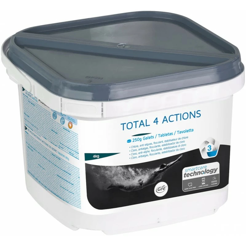 - 4 Azioni: cloro, antialghe, stabilizzante, flocculante.