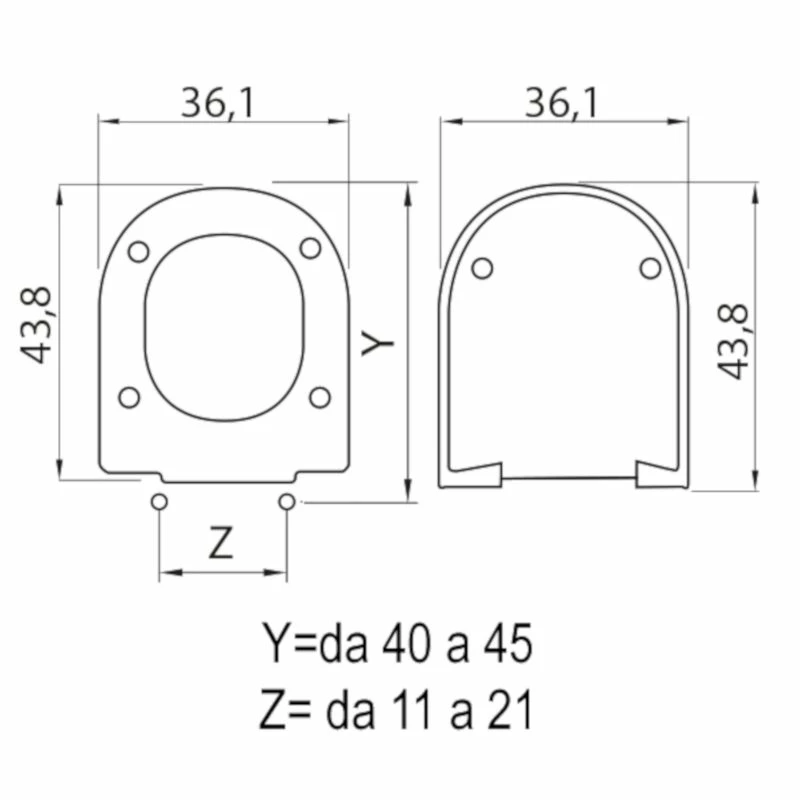 Il fissaggio wc è rapido, sicuro e può essere effettuato sia dall’alto che dal basso; grazie alle cerniere INOX regolabili con vite in metallo, le stesse cerniere possono essere regolate da 11 a 21 cm. Il sistema di chiusura copri tavoletta wc è quella tradizionale con paracolpi inclusi. Il materiale, le cerniere di qualità, la facilità di pulizia di questo copriwater lo rendono migliore rispetto ai prodotti in Mdf.