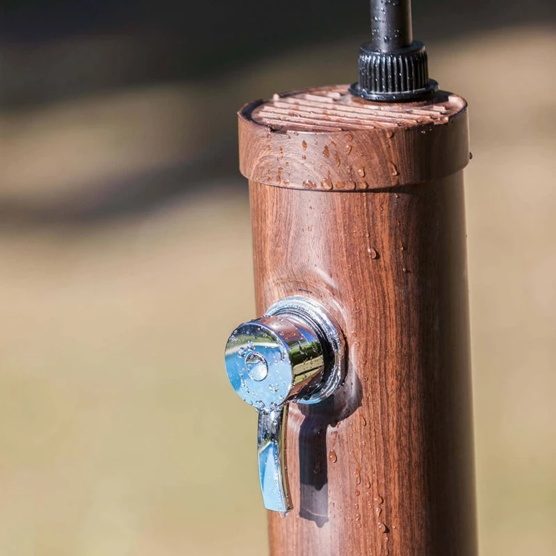 Composta da due pezzi: la parte inferiore di forma cilindrica in PVC effetto legno e la parte superiore in metallo. Grazie al suo design minimal e sobrio, diventa anche un elegante elemento decorativo per il giardino. È dotato di un serbatoio di accumulo in alluminio dalla capacità di 9 litri d’acqua e di un miscelatore per dosare sia la temperatura che il getto d’acqua, rendendo così il farsi la doccia un momento confortevole e rilassante.
