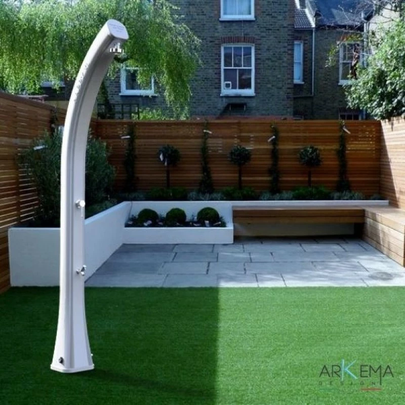 La doccia solare Arkema è dotata di struttura in resina termo plastica ad alta qualità, leggera e resistente al sale, al calcare, a forti raffiche di vento e ai piccoli urti accidentali. Queste caratteristiche permettono di collocarla in ambienti come terrazze, campeggi o spiagge.