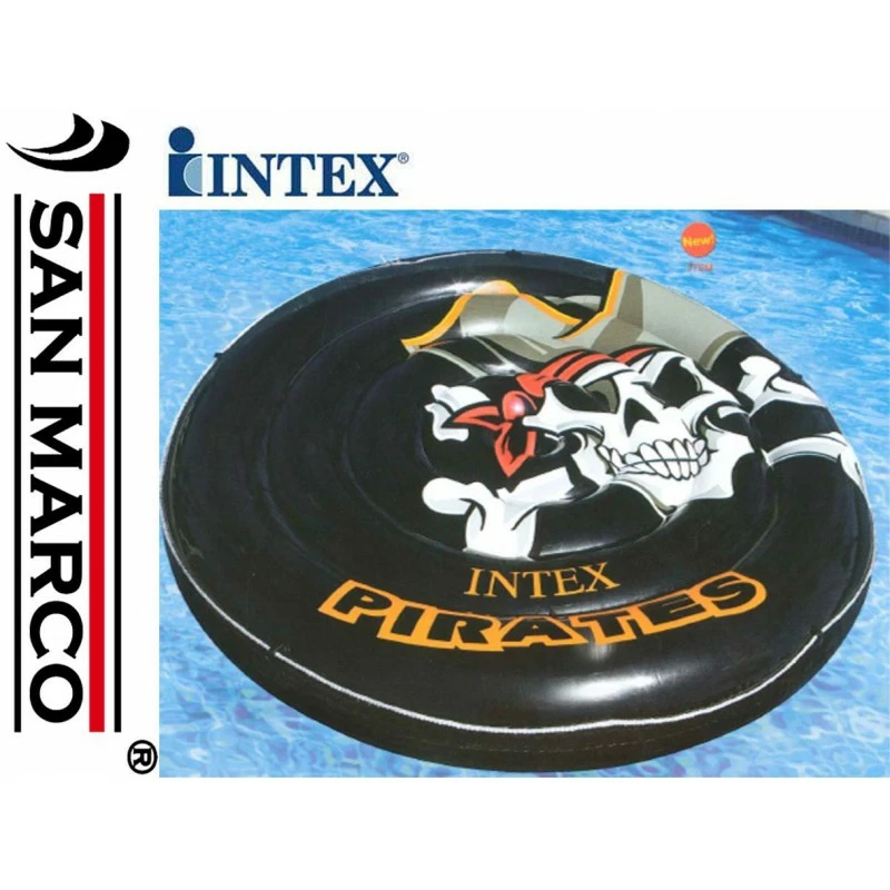 Materasso Intex rotondo gonfiabile di colore nero, con il simbolo dei pirati, ideato per i più piccoli, per il loro divertimento a mare o in piscina.