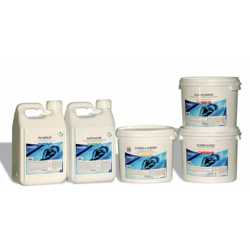 Set di prodotti per piscina con cloro chock o dicloro, cloro lento o tricloro, antialga, riduttore di Ph e pastiglie multiazioni, specifico per la depurazione batterica della vostra piscina.