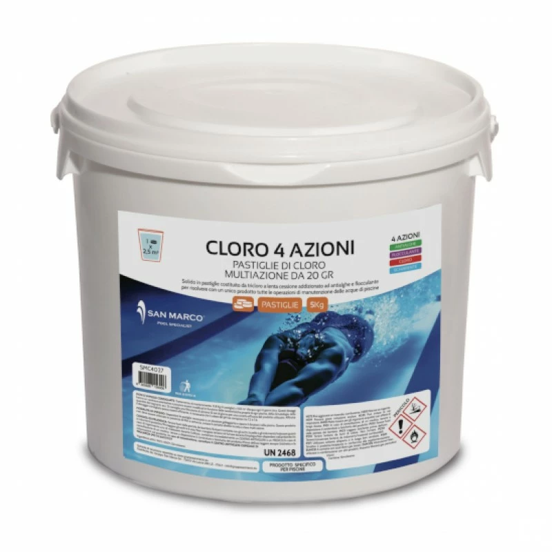 Il prodotto chimico 4 azioni per piscine è un coadiuvante alla filtrazione dell’acqua della piscina. Garantisce contemporaneamente trattamenti di cloro, di antialghe, di flocculante e schiarente per la piscina. È un prodotto rivoluzionario e professionale, a marchio POOL SPECIALIST e distribuito da San Marco, che permette in una sola applicazione di eliminare i batteri, virus e tutti i microrganismi contrastando il proliferare di alghe e mantenendo allo stesso tempo l’acqua trasparente e sopratutto cristallina.