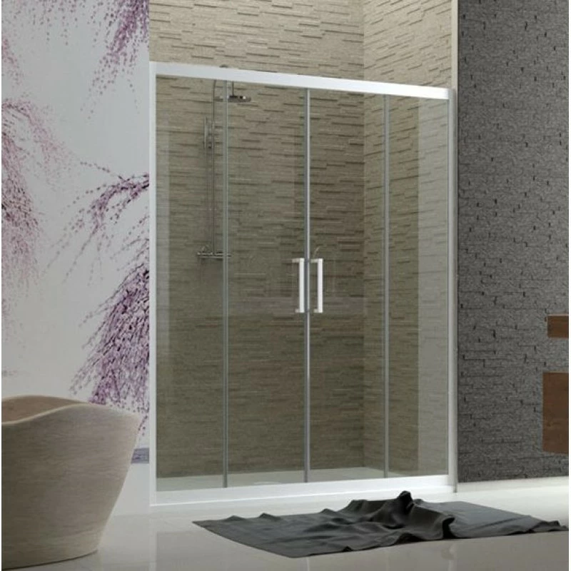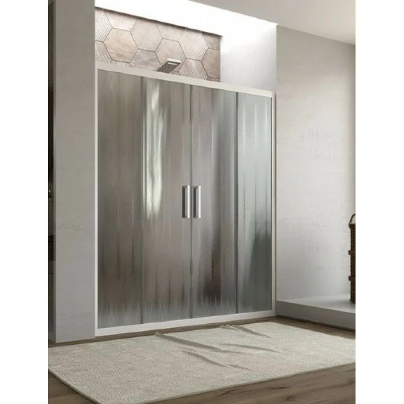 Elegante porta doccia dotata di doppia anta fissa e doppia anta scorrevole con ingreso centrale, con struttura e rifiniture in Pvc bianco lucido e vetri temperati da 6 mm.