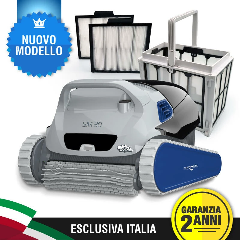 Il robot piscina Dolphin SM30 Maytronics risolverà tutti i vostri problemi legati alla pulizia della piscina da giardino. Dolphin SM30 è adatto a piscine fuori terra e interrate fino a 12 mt di lunghezza. Questo robot pulitore per piscina permette la pulizia completa del fondo, delle pareti e della linea d’acqua.