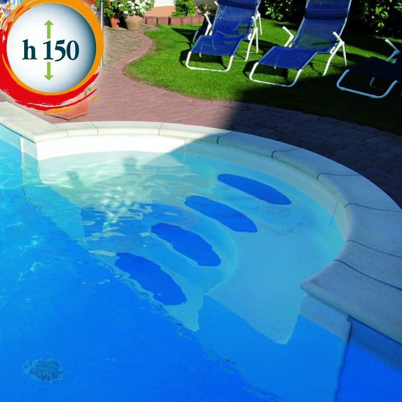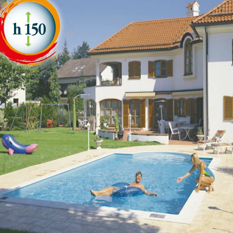 Piscina privata interrata da giardino in pannelli d’acciaio con una lunghezza di 6 mt. ed una larghezza di 4 mt. L’altezza della struttura è di 1,50 mt. con un’altezza del livello dell’acqua di 1,40 mt. I pannelli di ferro zincati prodotti in Germania, provengono dall’esperienza utilizzata in ambito automobilistico ed hanno un’elevata resistenza alla corrosione e grazie a questo presupposto, viene fornita una garanzia sulla struttura di 10 anni contro danni da ruggine, mentre la scala romana, di colore bianco, è realizzata in poliestere termoformato molto solido con la scalinata in abs di colore azzurro. La piscina è corredata da uno skimmer americano (a bocca larga); 2 valvole di ritorno; una presa di fondo; una scaletta in acciaio inox AISI 304 a 4 gradini; un kit di pulizia completo di testa aspirafango, termometro, tester, retino di superficie, asta telescopica e tubo per il collegamento allo skimmer; tappeto soft-walk per una maggiore sensazione di piacere durante l’appiedamento in piscina o meglio aiuta a prevenire danni durante qualche tuffo se qualcuno dovesse battere al suolo; kit di filtrazione Hayward da 10 m3/h completo di 100 Kg. di sabbia quarzifera e tubazione con relativa raccorderia necessaria per l’assemblaggio della parte idraulica; N° 2 fari a Led luce bianca. Inoltre la piscina viene fornita con liner a sacco in modo che l’installazione possa essere eseguita anche da personale poco esperto con il criterio “fai da te”, poichè questo potrà semplicemente essere agganciato e non dovrà essere termosaldato sul posto da personale qualificato.