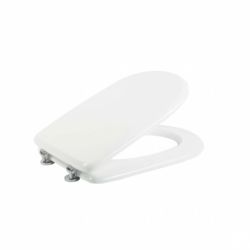 Questo sedile wc dal colore bianco con cerniere in metallo e superficie liscia è ideale per consetire una pulizia rapida e veloce.