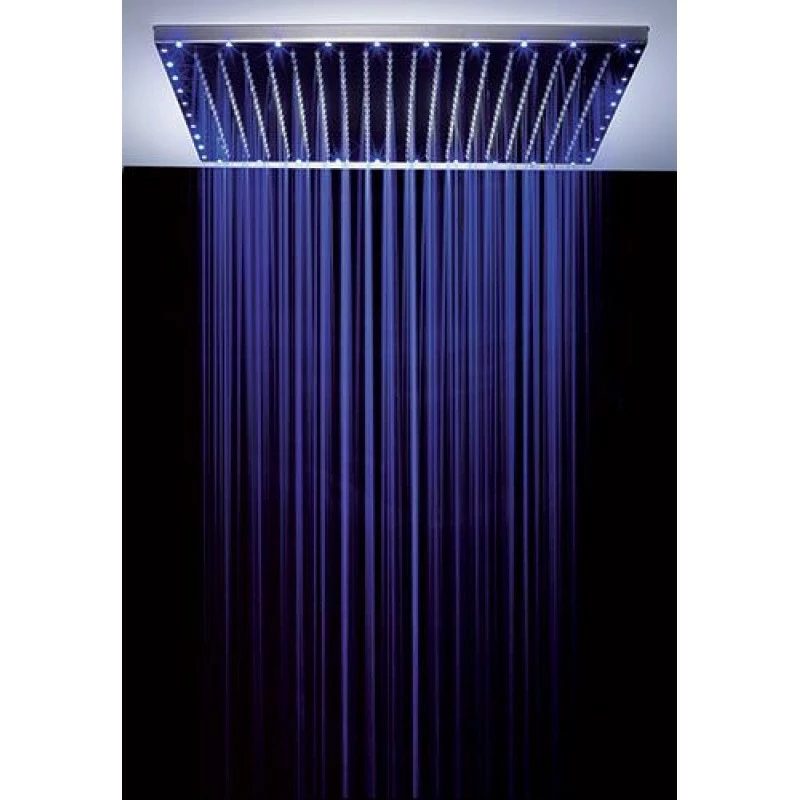 Soffione a soffitto in acciaio per cronoterapia con tecnologia a led. Non necessita di corrente elettrica o batterie ed assicura un’ elegante alternanza cromotica automatizzata in tre colorazioni: blu, verde e rosso si susseguono ogni 8 secondi.