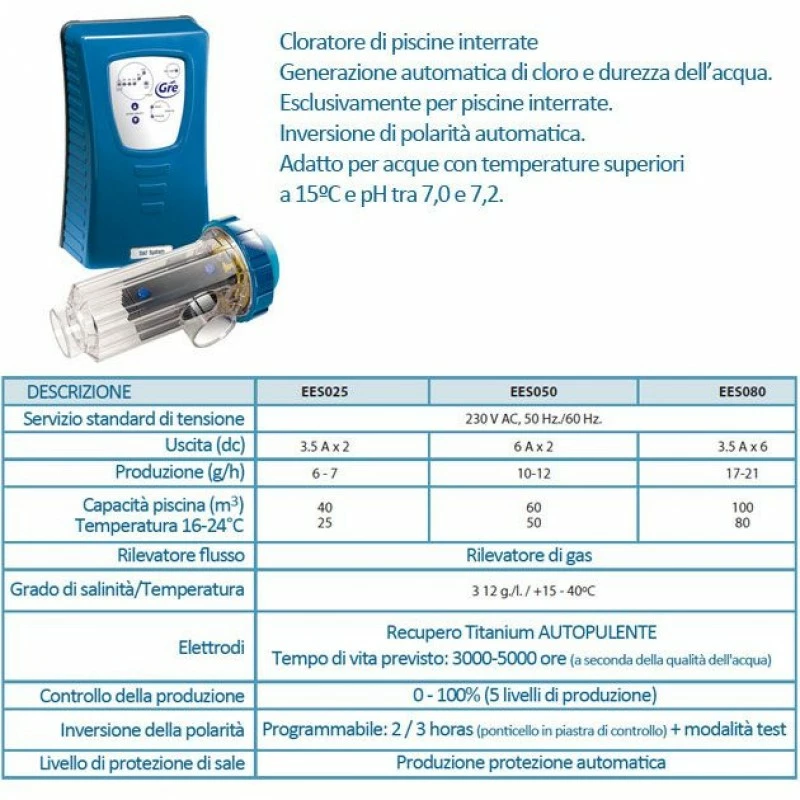 Il cloratore della Gre trasforma il comune sale in cloro per pulire la tua piscina, e questo avviene tramite la cella elettrolitica autopulente rivestita in titanio posta all’interno della macchina. Il processo utilizzato è il processo dell’elettrolisi salina. La macchina riesce a soddisfare le esigenze da lei richieste unicamente con una temperatura dell’acqua superiore ai 15° ed un pH compreso tra 7.0 e 7.2. E’ necessario ricordare l’utente che per avere un’tottimizzazione nella disinfezione della piscina è necessario mantenere il livello del pH fra i valori ottimali 7.0 e 7.2.